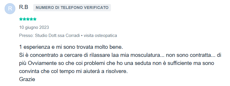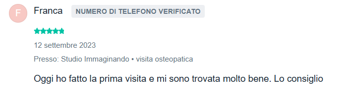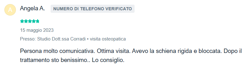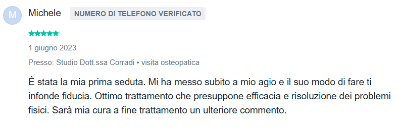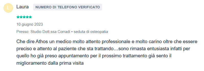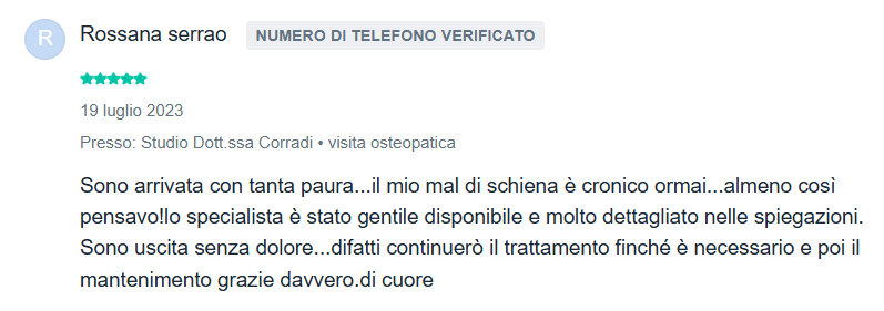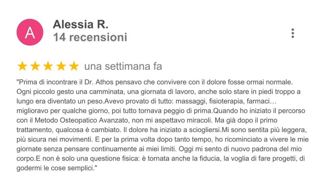 Ileana Tonarelli2025-05-21Trustindex verifica che la fonte originale della recensione sia Google. Ero bloccata ad una spalla e con una seduta è riuscito a rendermi di nuovo il movimento completo del braccio. Consiglio! Grazia Paloni2025-03-31Trustindex verifica che la fonte originale della recensione sia Google. Bravo e capace di mettere a proprio agio consentendo un rilassamento non sempre scontato in queste situazioni. Consigliatissimo. giorgio camisa2024-04-18Trustindex verifica che la fonte originale della recensione sia Google. Indubbiamente un professionista, con grande umiltà ti segue passo dopo passo consigliando un percorso giusto, non credevo oggi possibile un servizio di questo livello Annamaria Brunetti2023-10-25Trustindex verifica che la fonte originale della recensione sia Google. Grandissima professionalità . Esperienza assolutamente positiva. Lo consiglio vivamente , è un vero specialista nel suo campo. Durante i trattamenti si respira una grande tranquillità e si esce oltre che rigenerati anche con la sensazione di avere investito bene tempo e denaro. Consigliatissimo.Carica di più